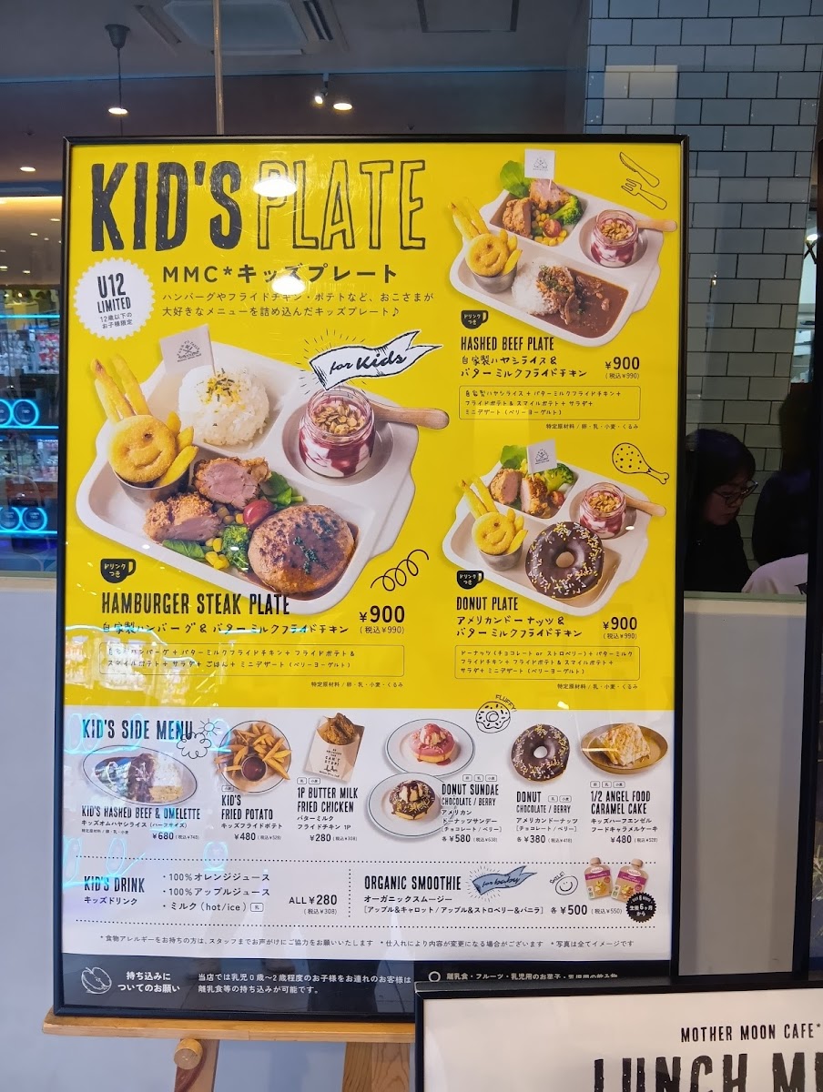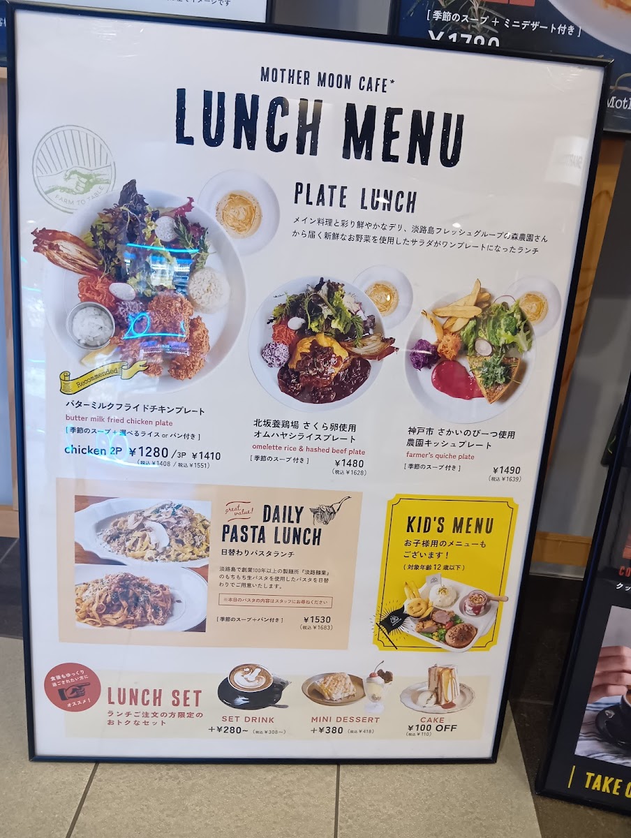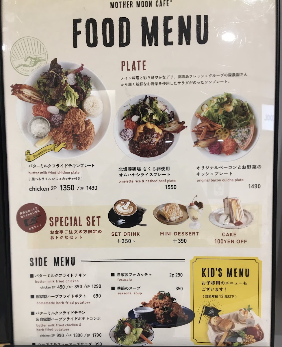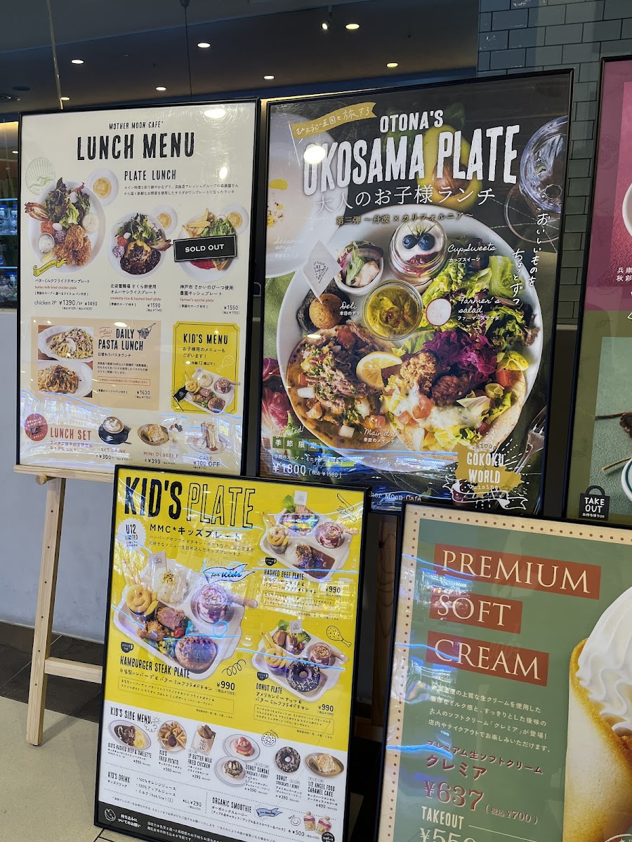 Mother Moon Cafe Umie in Kobe offers a delightful and diverse menu that caters to all tastes. For lunch, their standout dish is the "大人のお子様ランチ -但馬×スイス-" which beautifully blends flavors from Tajima and Switzerland. The side menu includes the fresh シーズナルファーマーズサラダ and hearty 石窯ライ麦パン (Rye Bread). Their set menu includes a drink option, セットドリンク, and a variety of cakes such as the Angel Food Caramel Cake, Double Cheese Tart, and Amish Country Cake. For younger guests, the KID'S PLATE features a homemade hamburger and buttermilk fried chicken, while the KID'S オムハヤシライス offers a half-sized omelet with hayashi rice. Additionally, the KID'S POTATO (fried potatoes) and KID'S DRINK (kids' drinks) make perfect additions to the children's meal. For dessert, their Chocolate Brownie Sundae is a must-try. During the daytime, the 大人のお子様ランチ -但馬×スイス- remains available, ensuring that both adults and children can enjoy an experience that perfectly captures the essence of the café. Whether you're visiting for a quick bite or a leisurely meal, Mother Moon Cafe offers a satisfying and varied selection that will please both young and old.