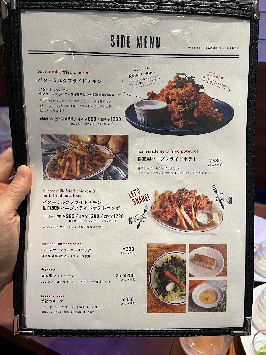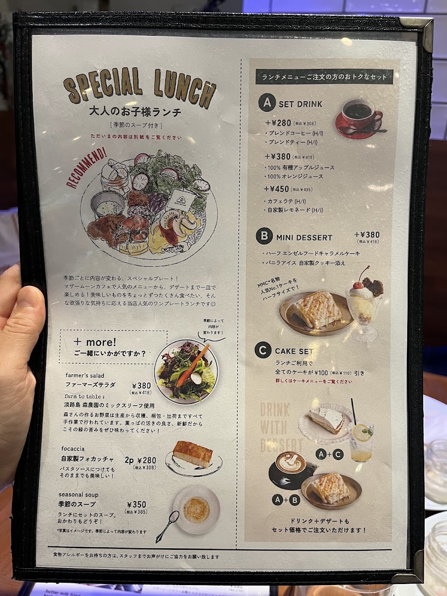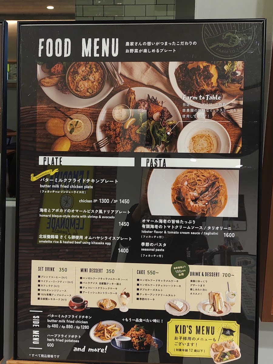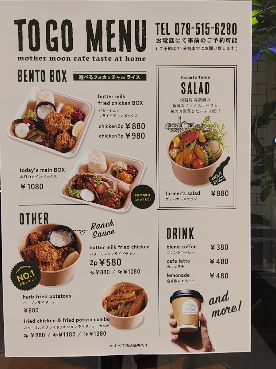 Mother Moon Cafe Umie in Kobe offers a delightful and diverse menu that caters to all tastes. For lunch, their standout dish is the "大人のお子様ランチ -但馬×スイス-" which beautifully blends flavors from Tajima and Switzerland. The side menu includes the fresh シーズナルファーマーズサラダ and hearty 石窯ライ麦パン (Rye Bread). Their set menu includes a drink option, セットドリンク, and a variety of cakes such as the Angel Food Caramel Cake, Double Cheese Tart, and Amish Country Cake. For younger guests, the KID'S PLATE features a homemade hamburger and buttermilk fried chicken, while the KID'S オムハヤシライス offers a half-sized omelet with hayashi rice. Additionally, the KID'S POTATO (fried potatoes) and KID'S DRINK (kids' drinks) make perfect additions to the children's meal. For dessert, their Chocolate Brownie Sundae is a must-try. During the daytime, the 大人のお子様ランチ -但馬×スイス- remains available, ensuring that both adults and children can enjoy an experience that perfectly captures the essence of the café. Whether you're visiting for a quick bite or a leisurely meal, Mother Moon Cafe offers a satisfying and varied selection that will please both young and old.